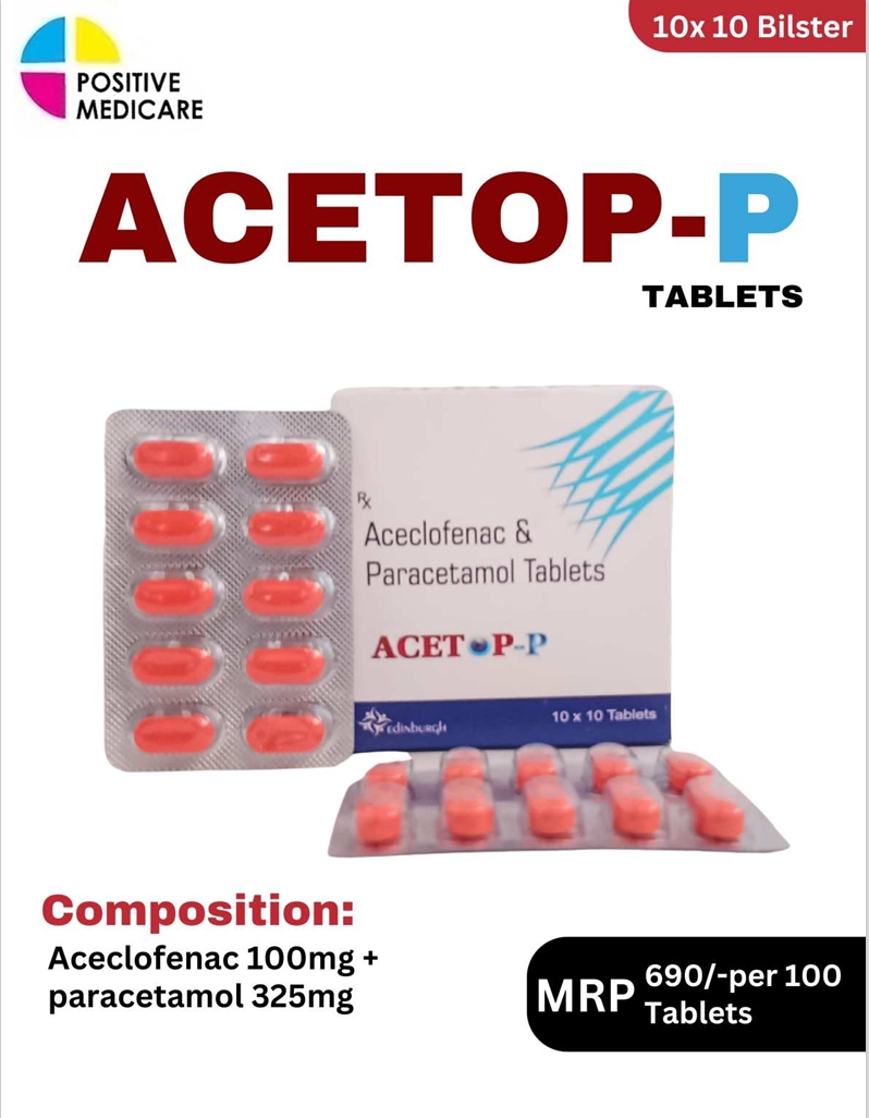 ACETOP P contains Aceclofenac 100 mg + Paracetamol 325 mg, a widely used combination for effective pain relief and inflammation control. Aceclofenac reduces swelling and inflammation, while Paracetamol helps relieve pain and fever. This combination is commonly used in conditions like joint pain, muscle pain, backache, dental pain, and arthritis, helping improve comfort and daily mobility.