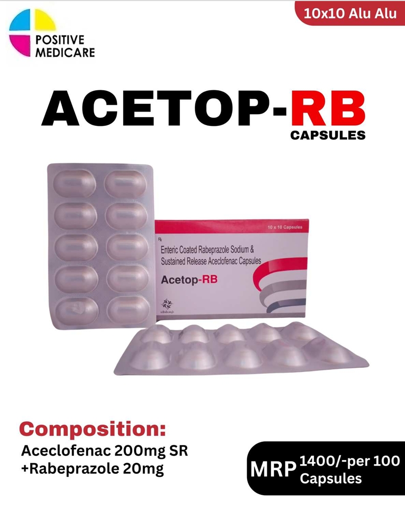 ACETOP RB CAP contains Aceclofenac 200 mg + Rabeprazole 20 mg, a combination designed to provide pain relief with gastric protection. Aceclofenac helps reduce pain and inflammation, while Rabeprazole lowers stomach acid and protects against gastric irritation caused by NSAIDs. It is commonly used in arthritis, joint pain, and musculoskeletal conditions, ensuring effective relief with better stomach safety.