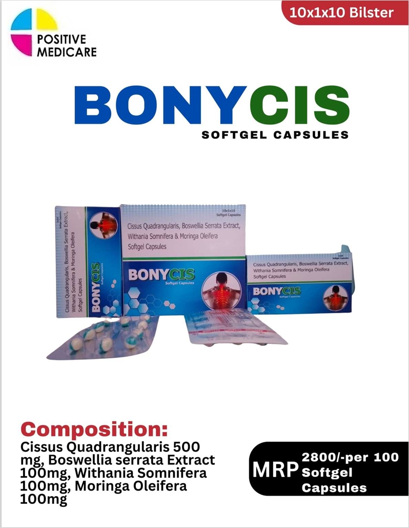 BONYCIS CAP is a herbal formulation designed to support bone strength and joint health. It contains Cissus Quadrangularis 500 mg to promote bone healing, Boswellia Serrata Extract 100 mg to reduce inflammation, and Withania Somnifera 100 mg with Moringa Oleifera 100 mg to improve strength and recovery. This combination helps in fracture healing, joint pain, and overall musculoskeletal wellness.