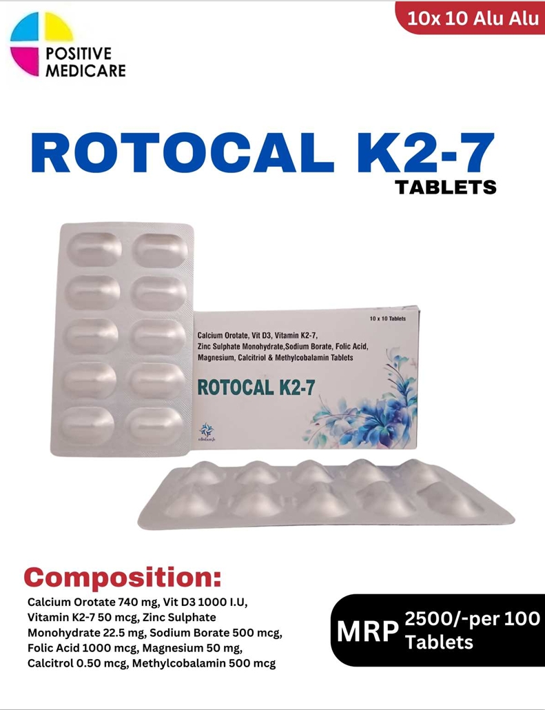 ROTOCAL K2-7 TAB contains Calcium Orotate 740 mg + Vitamin D3 1000 IU + Vitamin K2-7 50 mcg + Zinc Sulphate Monohydrate 22.5 mg + Sodium Borate 500 mcg + Folic Acid 1000 mcg + Magnesium 50 mg + Calcitriol 0.50 mcg + Methylcobalamin 500 mcg. It is a comprehensive bone health supplement that helps improve calcium absorption, strengthen bones, and support joint health. It is especially useful in osteoporosis and calcium deficiency conditions.