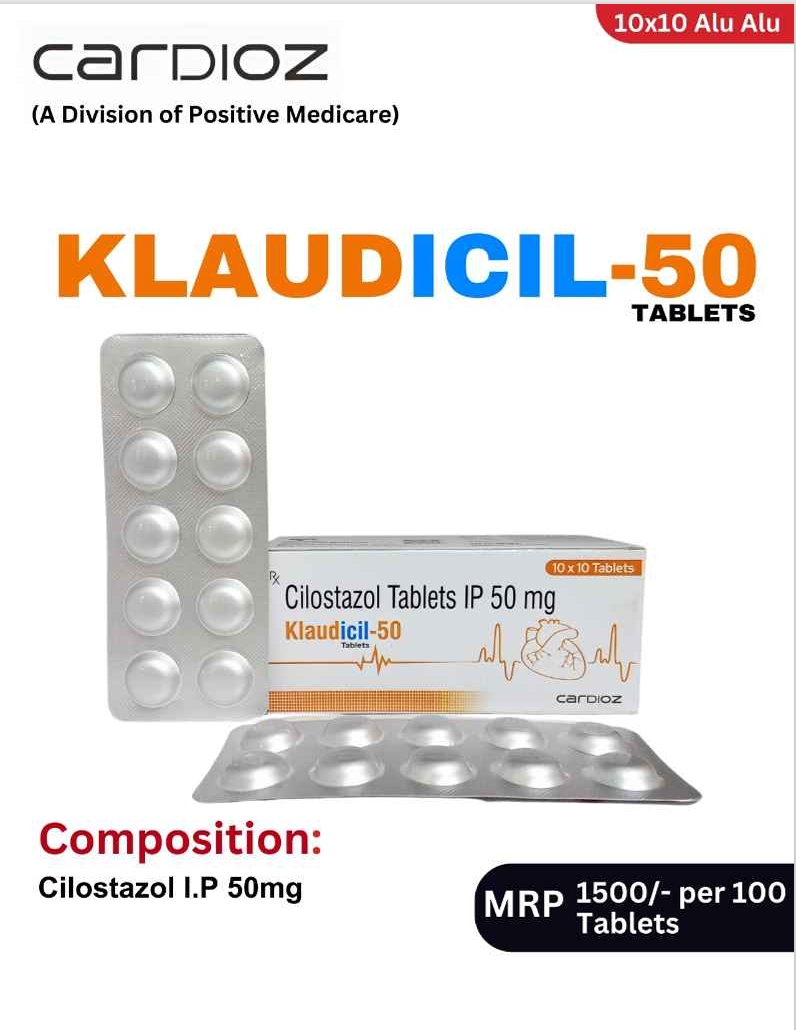 KLAUDICIL 50 contains Cilostazol 50 mg, a medicine used to improve blood circulation, especially in peripheral arterial disease. It works by dilating blood vessels and inhibiting platelet aggregation, which enhances blood flow to the limbs. Regular use helps reduce symptoms like leg pain while walking (claudication) and improves walking distance and overall mobility in affected patients.