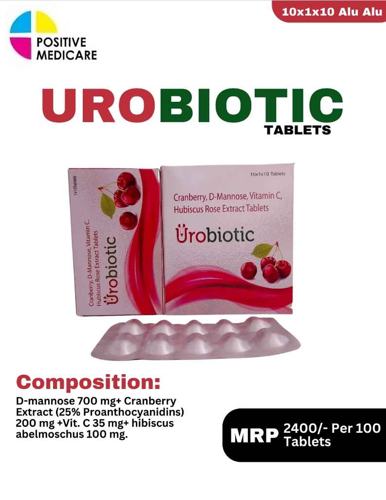 UROBIOTIC Tablet contains D-Mannose 700 mg + Cranberry Extract (25% Proanthocyanidins) 200 mg + Vitamin C 35 mg + Hibiscus abelmoschus 100 mg, a well-designed formulation for urinary tract health. D-Mannose and cranberry help prevent bacterial adhesion in the urinary tract, while Vitamin C supports immunity and urinary acidification. Hibiscus adds supportive antioxidant benefits, making it effective in preventing recurrent UTIs and maintaining urinary hygiene.