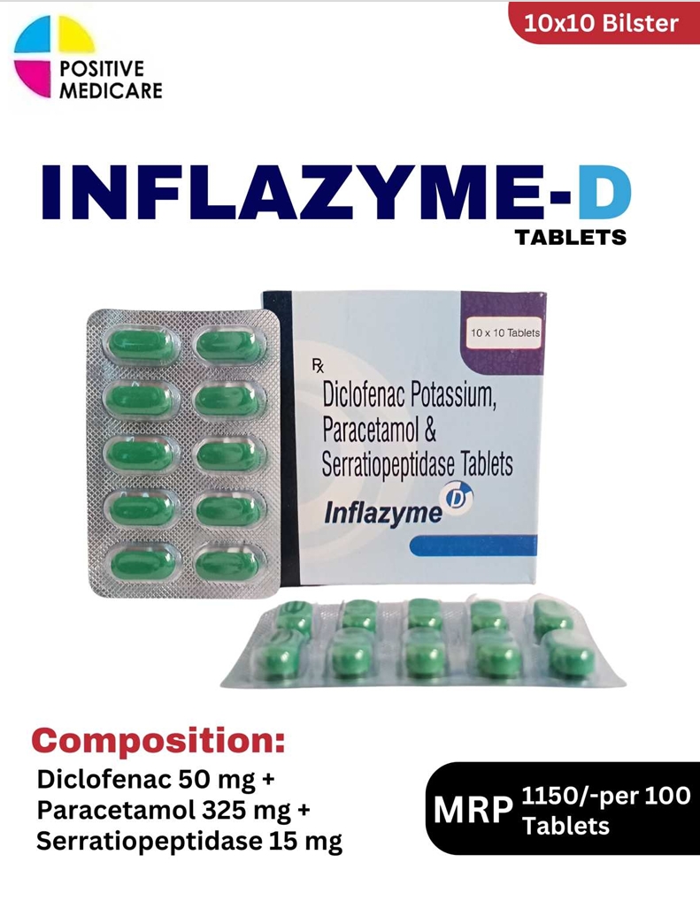 INFLAZYME D is a well-balanced combination designed to manage pain, inflammation, and swelling together. It contains Diclofenac 50 mg for fast anti-inflammatory action, Paracetamol 325 mg to enhance pain relief, and Serratiopeptidase 15 mg to reduce swelling and support healing. This combination is especially useful in conditions like injury, post-surgical pain, and musculoskeletal disorders, helping patients recover comfortably and quickly.