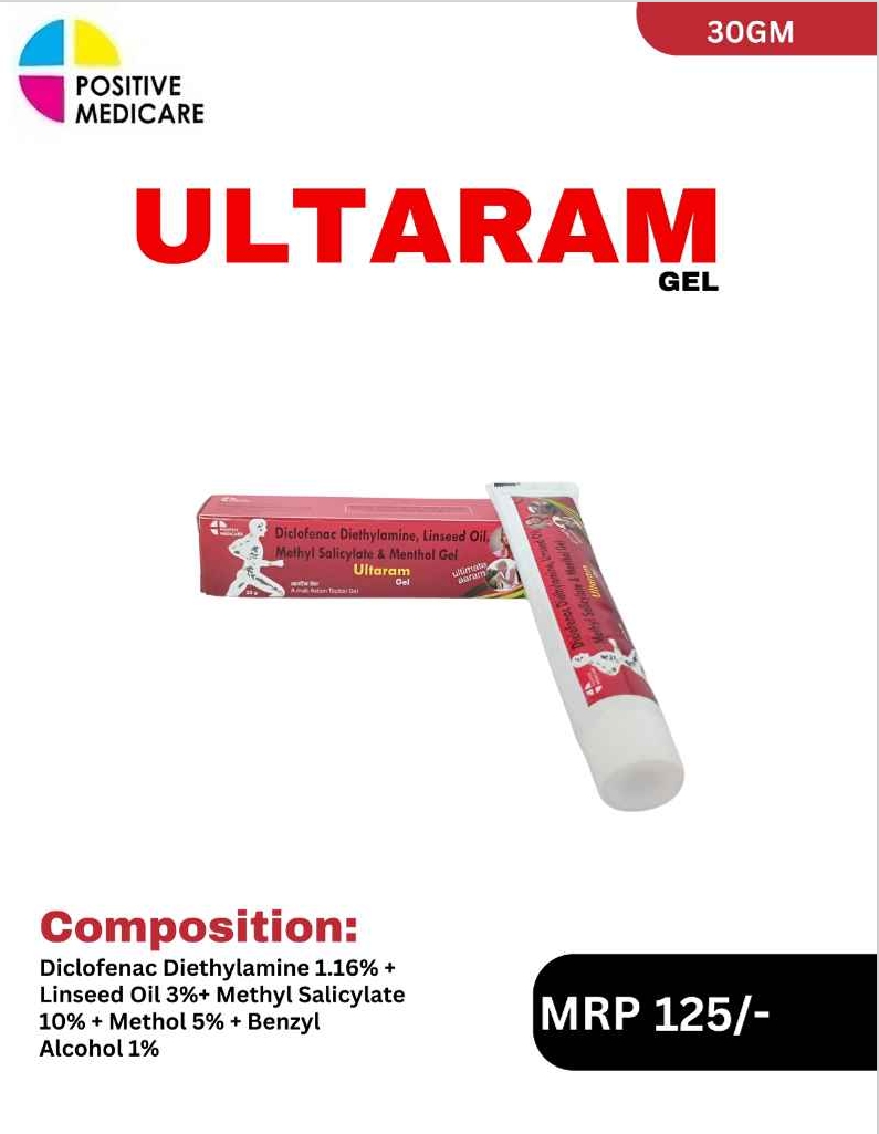 ULTARAM GEL is a topical formulation designed for quick relief from localized pain and inflammation. It contains Diclofenac Diethylamine 1.16% for anti-inflammatory action, Methyl Salicylate 10% and Menthol 5% for soothing and cooling effect, along with Linseed Oil 3% and Benzyl Alcohol 1% to enhance penetration and comfort. It is useful in muscle pain, sprains, and joint stiffness, providing fast and targeted relief.