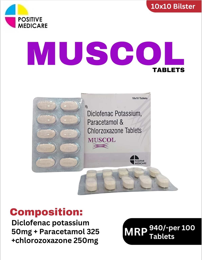 MUSCOL is a well-balanced combination for managing pain associated with muscle spasm and inflammation. It contains Diclofenac Potassium 50 mg for fast pain and inflammation relief, Paracetamol 325 mg to enhance analgesic action, and Chlorzoxazone 250 mg to relax stiff muscles. This combination is useful in conditions like back pain, sprains, and muscle injuries, helping improve mobility and overall comfort.