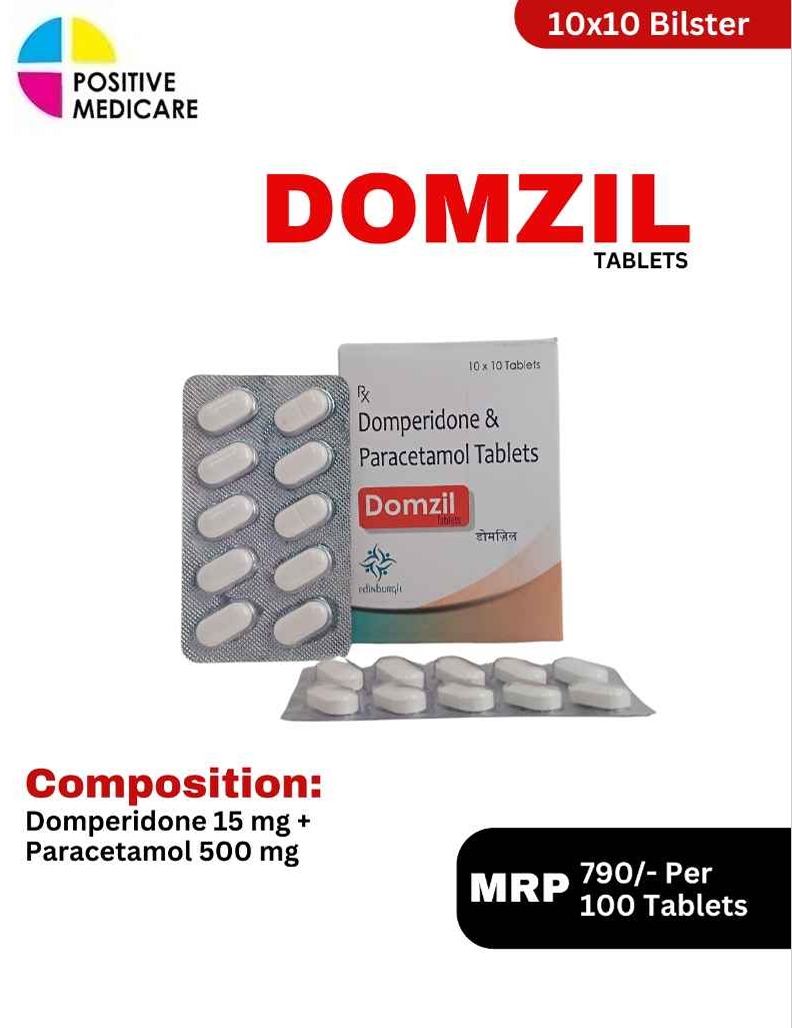 DOMZIL contains Domperidone 15 mg + Paracetamol 500 mg, a combination used to manage nausea, vomiting, and associated discomfort like headache or mild pain. Domperidone helps control nausea and improves gastric motility, while Paracetamol provides effective relief from pain and fever. This combination is useful in conditions like gastritis, migraine-associated nausea, or general illness where both symptoms occur together, improving overall patient comfort.