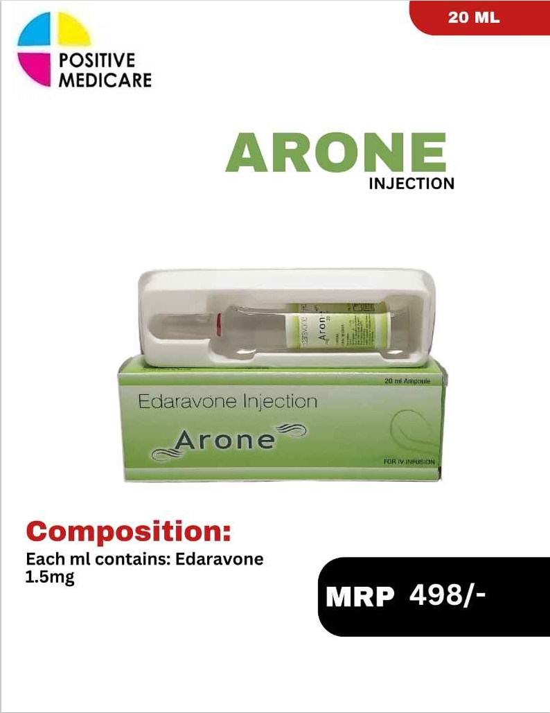 ARONE Injection contains Edaravone 1.5 mg per ml, a neuroprotective agent used in the management of conditions like acute ischemic stroke and amyotrophic lateral sclerosis (ALS). It works by reducing oxidative stress and protecting nerve cells from damage. This helps in slowing disease progression and improving neurological outcomes, making it a valuable option in critical neuro care management.