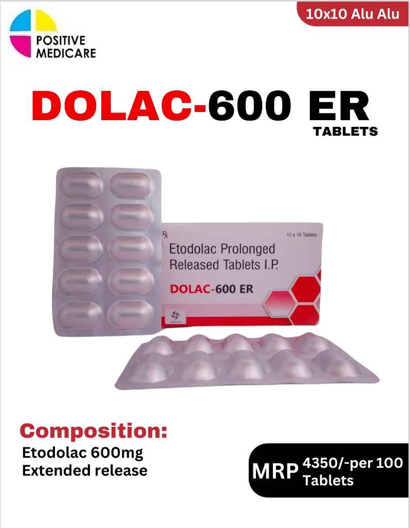 DOLAC 600 ER contains Etodolac Prolonged Release Tablets 600 mg. It is a non-steroidal anti-inflammatory drug (NSAID) used for relieving pain, inflammation, and swelling associated with conditions like osteoarthritis, rheumatoid arthritis, and musculoskeletal disorders. The prolonged-release formulation provides long-lasting effect with better compliance. It helps improve mobility and reduces stiffness by controlling pain mediators, offering sustained relief throughout the day when taken as prescribed by the physician.