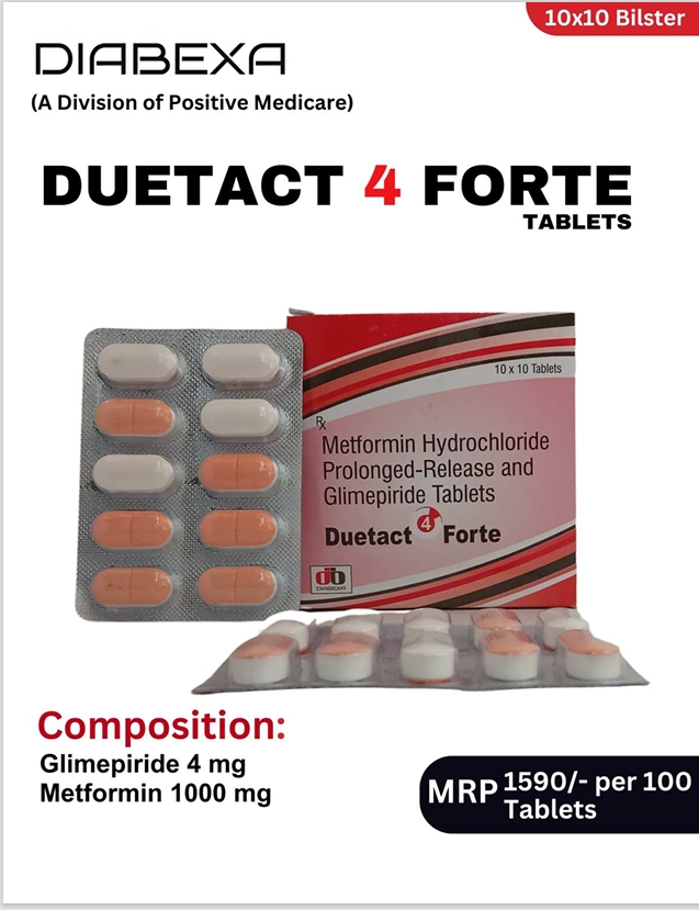 DUET ACT 4 FORTE contains Glimepiride 4 mg + Metformin 1000 mg (SR), a high-strength combination for managing type 2 diabetes. Glimepiride helps boost insulin release, while Metformin works by reducing glucose production in the liver and improving insulin sensitivity. This formulation is suitable for patients needing tighter blood sugar control and helps reduce long-term complications when used with proper diet and lifestyle.