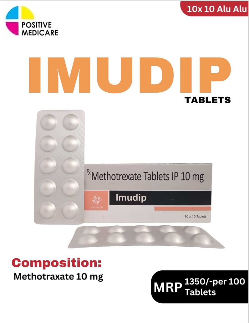 Imudip Tablet contains Methotrexate 10 mg as its active ingredient. It is mainly used in the management of rheumatoid arthritis, severe psoriasis, and other autoimmune conditions. It works by calming down the overactive immune system and slowing abnormal cell growth, which helps reduce pain, swelling, and disease progression. This medicine should always be taken under strict medical supervision due to its strong action on the body.