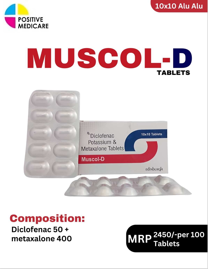 Muscol D Tablet contains Diclofenac 50 mg + Metaxalone 400 mg as its active composition. It is used for relief from muscle pain, stiffness, and inflammation associated with sprains, strains, and musculoskeletal conditions. Diclofenac helps reduce pain and swelling, while Metaxalone acts as a muscle relaxant, easing muscle spasms. Together, they provide effective comfort and improve movement, helping patients recover faster from painful muscle conditions.