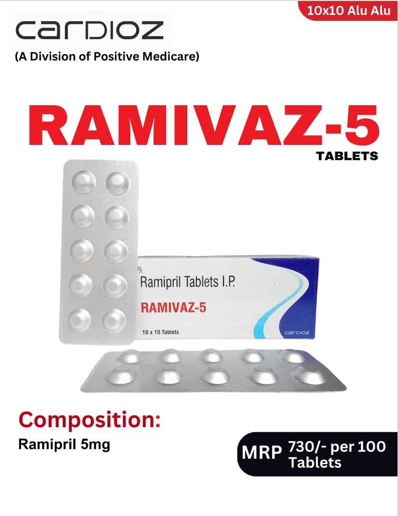 RAMIVAZ 5 contains Ramipril 5 mg, an ACE inhibitor used for managing high blood pressure and protecting heart health. It works by relaxing and widening blood vessels, making it easier for the heart to pump blood. Regular use helps control BP, reduces strain on the heart, and lowers the risk of heart attack, stroke, and kidney-related complications, especially in high-risk patients.