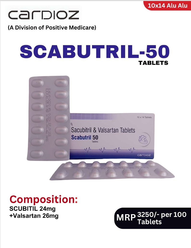Scabutril 50 is used in the management of heart failure to improve heart function and reduce hospitalization risk. It contains Sacubitril + Valsartan, which works by enhancing natriuretic peptides and blocking angiotensin receptors, leading to better blood vessel relaxation and reduced fluid overload. This combination helps improve cardiac efficiency, reduce symptoms like breathlessness and fatigue, and supports better long-term heart outcomes.