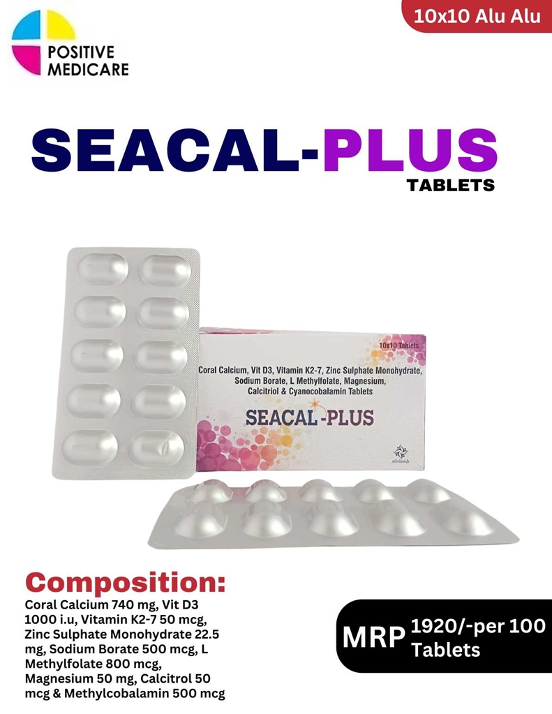 SEACAL PLUS TAB is a comprehensive bone health supplement designed to support strength and mineral balance. It contains Coral Calcium 740 mg with Vitamin D3 1000 IU and Calcitriol 0.50 mcg for better absorption, along with Vitamin K2-7 50 mcg to direct calcium to bones. Added nutrients like Magnesium 50 mg, Zinc, and Methylcobalamin 500 mcg support bone density and nerve health.