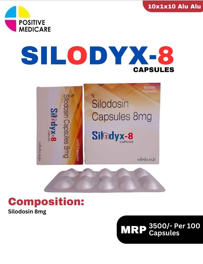 SILODYX 8 contains Silodosin 8 mg, a selective alpha-1 adrenergic blocker used in the management of benign prostatic hyperplasia (BPH). It works by relaxing the smooth muscles in the prostate and bladder neck, making it easier to pass urine. This helps reduce symptoms like weak stream, difficulty in urination, and frequent urges, improving overall urinary comfort and quality of life in patients.