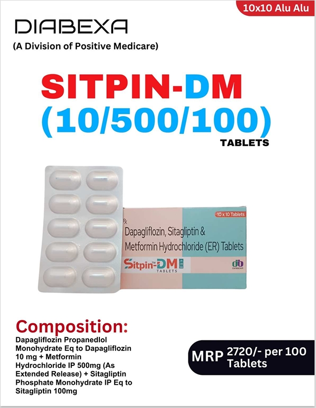 SITPIN DM 10/500/100 contains Dapagliflozin 10 mg + Metformin Hydrochloride 500 mg (ER) + Sitagliptin 100 mg, a triple-action combination for comprehensive type 2 diabetes control. Dapagliflozin removes excess glucose through urine, Metformin improves insulin sensitivity and reduces liver glucose production, while Sitagliptin enhances insulin release after meals. This advanced formula helps maintain stable blood sugar levels and supports stronger long-term glycemic management.