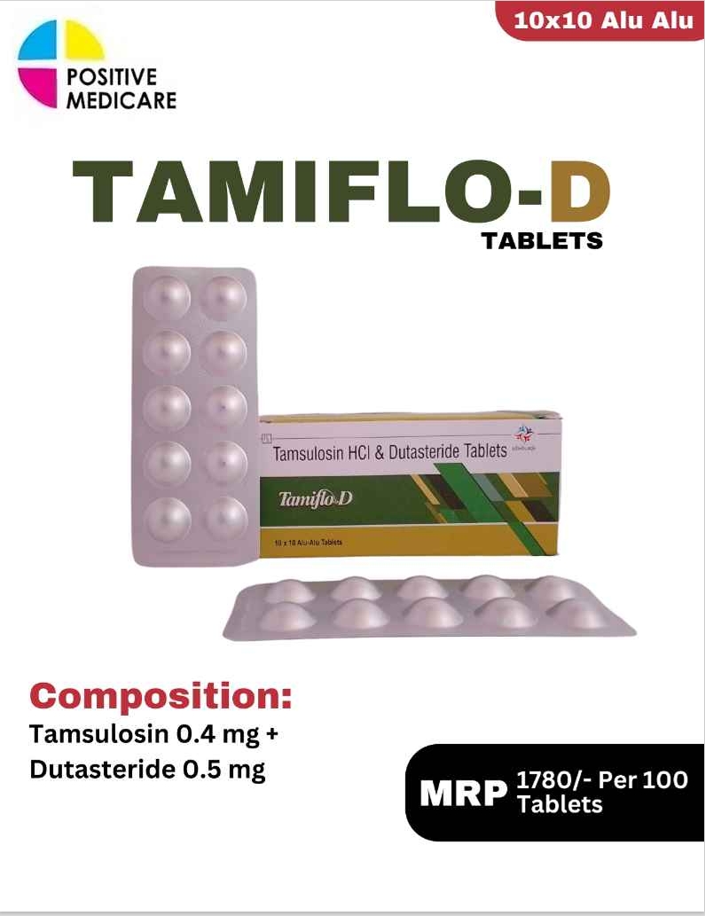 TAMIFLO D contains Tamsulosin 0.4 mg + Dutasteride 0.5 mg, a well-established combination used in the management of benign prostatic hyperplasia (BPH). Tamsulosin helps relax the muscles in the prostate and bladder neck for better urine flow, while Dutasteride reduces prostate size over time. Together, they provide both quick symptom relief and long-term improvement in urinary function.