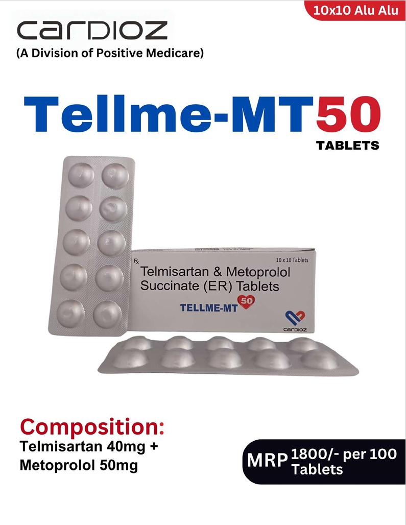 TELLME MT 50 contains Telmisartan 40 mg + Metoprolol 50 mg. This combination helps manage high blood pressure by relaxing blood vessels and reducing the heart rate. Telmisartan improves blood flow, while Metoprolol lowers the workload on the heart. It is especially useful in patients who need stronger heart rate control along with BP management, offering better overall cardiovascular protection.