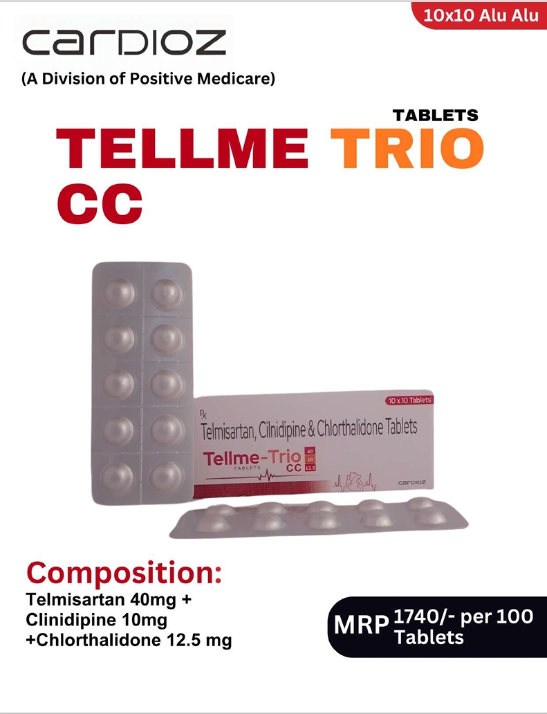 TELLME CC combines Telmisartan 40 mg + Cilnidipine 10 mg + Chlorthalidone 12.5 mg. This advanced combination offers strong blood pressure control by targeting multiple pathways. It relaxes blood vessels and removes extra fluid, making it suitable for patients with difficult-to-control hypertension