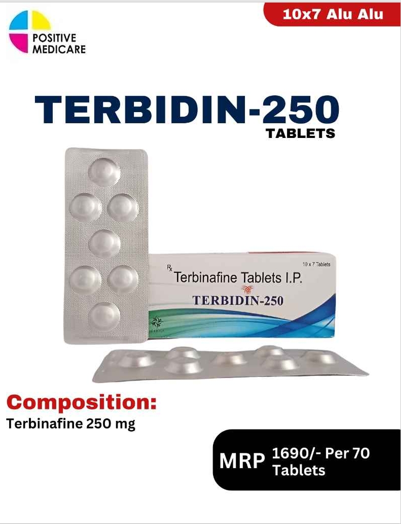 TERBIDIN contains Terbinafine 250 mg, an antifungal medication used for the treatment of fungal infections of the skin, nails, and scalp. It works by inhibiting fungal cell membrane synthesis, leading to effective elimination of the infection. It is commonly prescribed in conditions like ringworm, athlete’s foot, and onychomycosis, helping provide long-lasting relief and preventing recurrence when taken as advised.