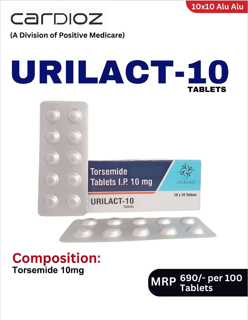 URILACT 10 contains Torsemide 10 mg, a loop diuretic that helps remove excess fluid and salt from the body through urine. It is commonly used in conditions like swelling (edema) and high blood pressure. By reducing fluid buildup, it decreases the workload on the heart and improves breathing in patients with fluid retention, supporting better overall heart and kidney function.