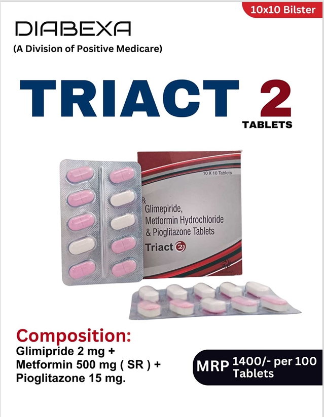 TRI ACT 2 contains Glimepiride 2 mg + Metformin 500 mg (SR) + Pioglitazone 15 mg, a triple-combination therapy designed for effective control of type 2 diabetes. Glimepiride stimulates insulin release, Metformin improves insulin sensitivity and reduces glucose production, while Pioglitazone enhances peripheral glucose utilization. Together, they help achieve better glycemic control, stabilize blood sugar levels, and support long-term diabetes management.