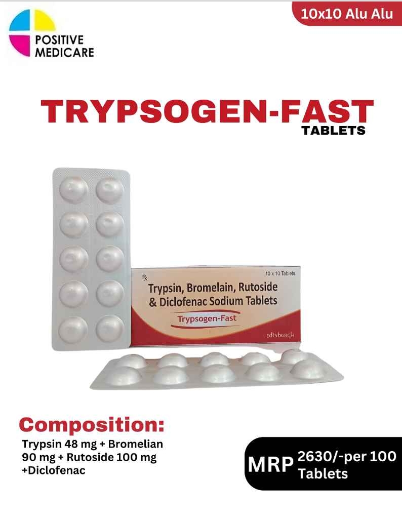 TRYPSOGEN FAST is a powerful combination designed for quick relief from pain and inflammation along with faster healing. It contains Trypsin 48 mg and Bromelain 90 mg to reduce swelling and support tissue repair, Rutoside 100 mg to strengthen capillaries, and Diclofenac for effective pain relief. This combination is useful in injuries, post-surgical conditions, and inflammatory disorders, helping speed up recovery and improve comfort.