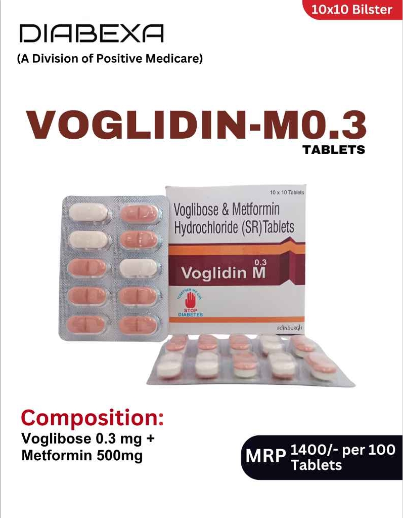 VOGLIDIN M.3 contains Voglibose 0.3 mg + Metformin 500 mg, a dual-action combination designed to control type 2 diabetes effectively, especially after meals. Voglibose delays carbohydrate digestion to reduce post-meal sugar spikes, while Metformin lowers liver glucose production and improves insulin sensitivity. This combination helps achieve better blood sugar stability and supports long-term glycemic control in diabetic patients.